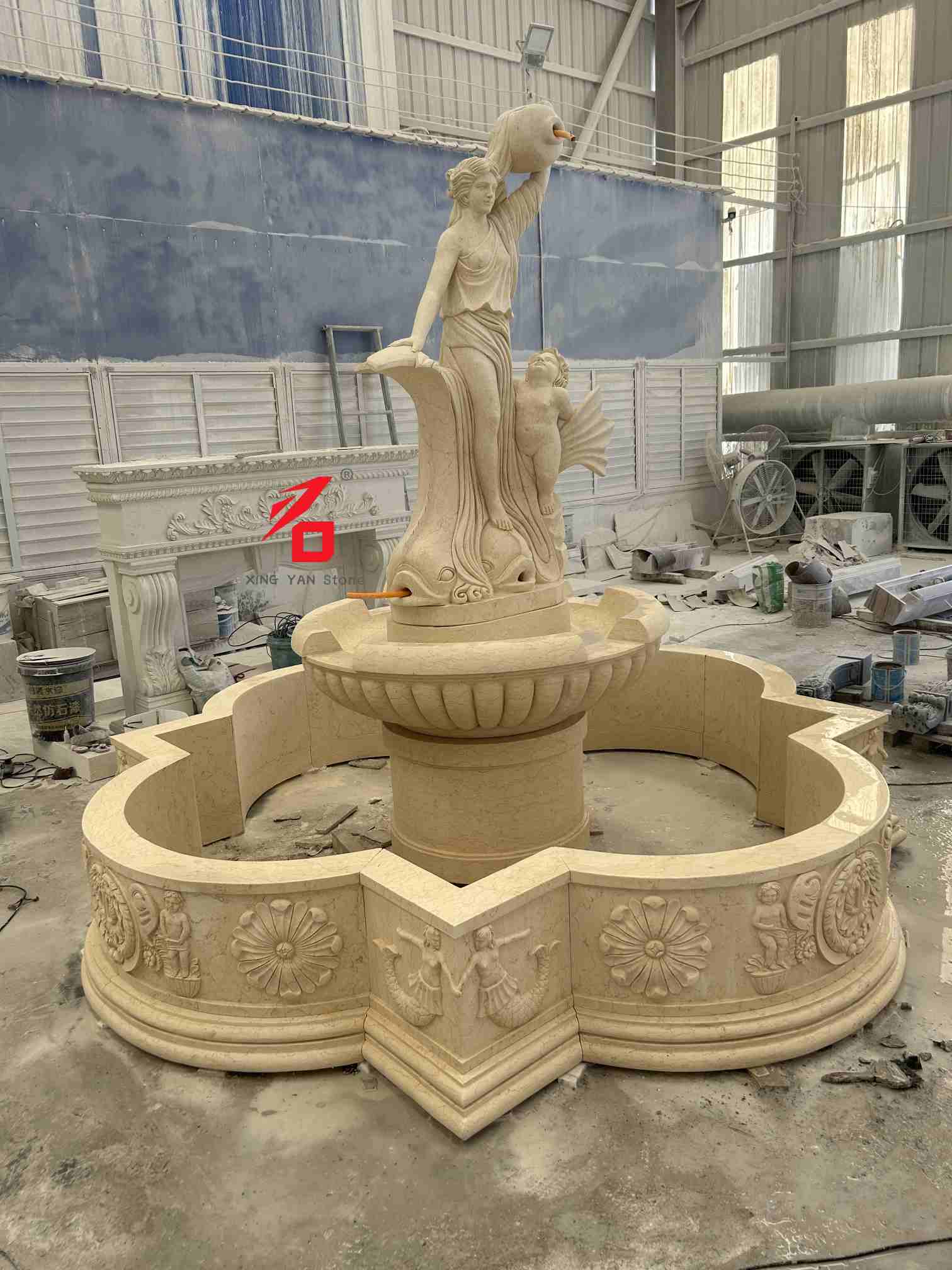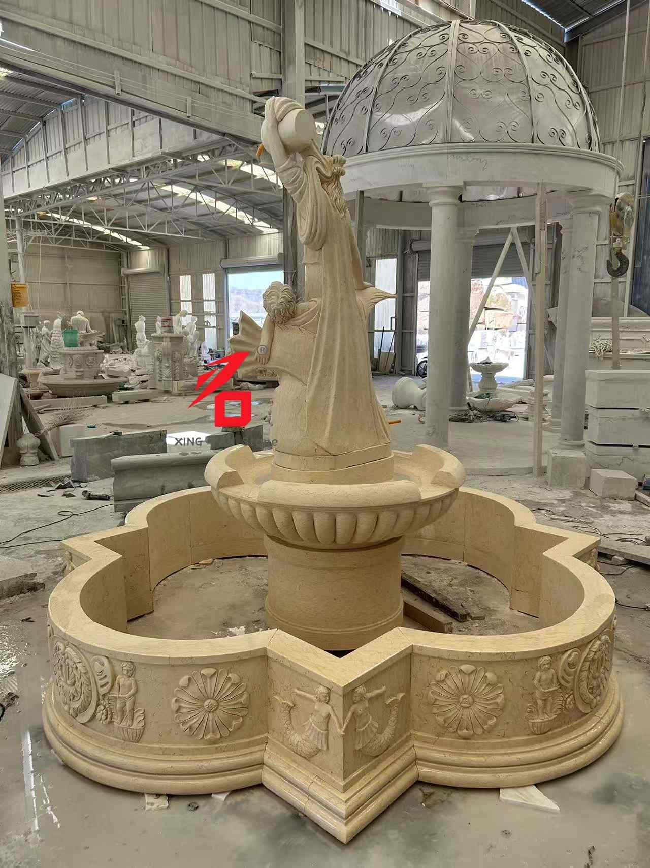 Опције камена: Опције прилагођеног камена укључују беж мермер, бели мермер, пешчар и друго природно камење. Фина текстура камена, топла боја и јака отпорност на временске услове обезбеђују издржљивост фонтане и естетску привлачност за дуготрајну употребу на отвореном. Умеће резбарења: Користећи традиционалне технике ручног резбарења, искусни вајари педантно израђују сваки детаљ, од израза лица богиње и драперије до детета и украса у облику рибе, показујући уметничку текстуру и тродимензионалност европске класичне скулптуре.